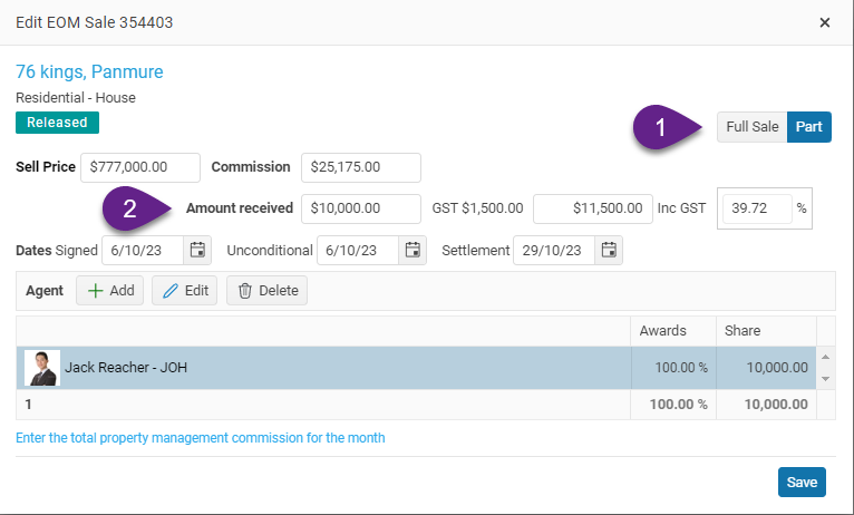 However, if the amount is entered using the Part option, the system will correctly allocate 10% of the sale to the agent.